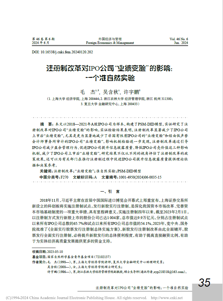 由永利集团官网许宇鹏副教授作为通讯作者合作撰写的论文《注册制改革对IPO公司“业绩变脸”的影响:一个准自然实验》在《外国经济与管理》(学校A类期刊、CSSCI、FMS管理科学高质量期刊)2024年第6期上发表。该论文是许宇鹏副教授主持承担的国家自然科学青年基金项目的阶段性研究成果。
